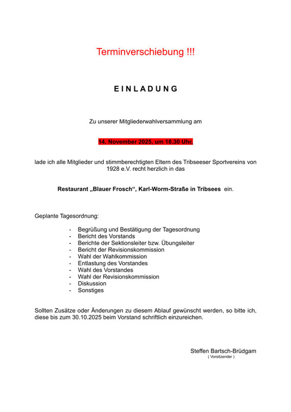 Der Tribseeser SV ist ein Sportverein mit Tradition, beheimatet in der Trebeltal Region und mittlerweile mit sechs Sektionen aufgestellt. Besonders im Nachwuchsbereich konnten wir in der Vergangenheit gute Entwicklungen verzeichnen.